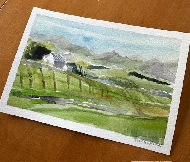 Explore the art of watercolor painting with Bird & Bear Member, Patricia Shaw of Patricia Shaw Illustrations. You’ll learn about materials, paint palette and technique as you experiment and create your very own landscape card or print (see sample below)..